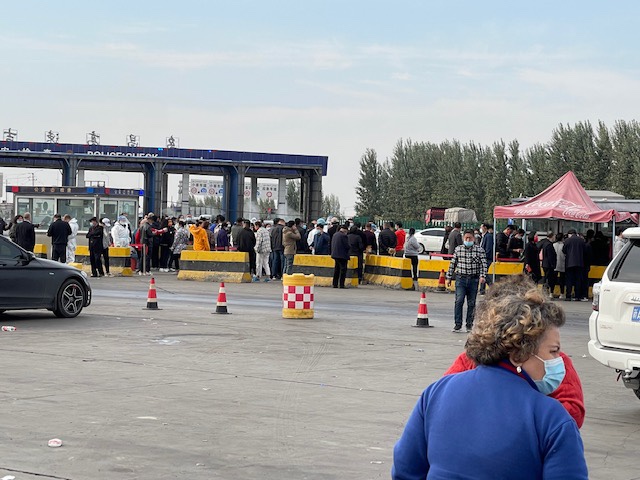 We raced to our finishing point. Even if we weren’t sure if that would be the end of our nightmare journey, just the imaginative goal of reaching a Covid test point in Urumqi felt like we were earning our completion medal. When we got there, hundreds of cars had already lined the circumference of the stadium. Everyone else too clearly wanted this nightmare to end.