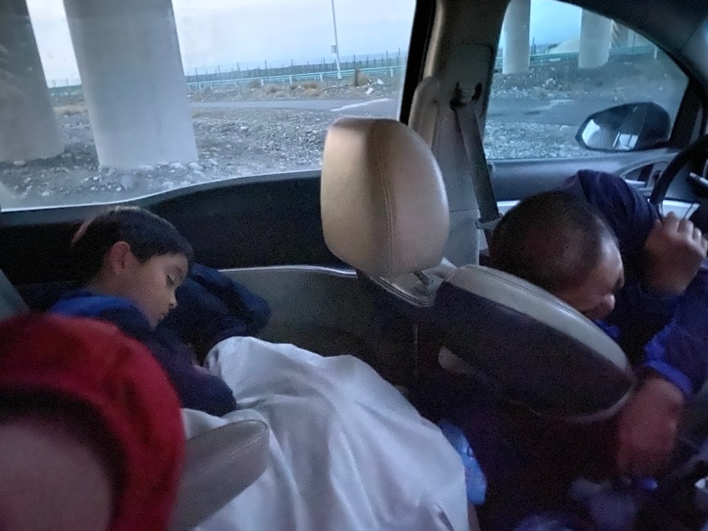 I was worried for our safety at that point. I tried to stay awake throughout, in case I could help the driver stay focused. Meanwhile, the only thing I could do was to tighten the seatbelts of the two little ones, who by then had nestled into their own fœtal positions and deep in sleep.