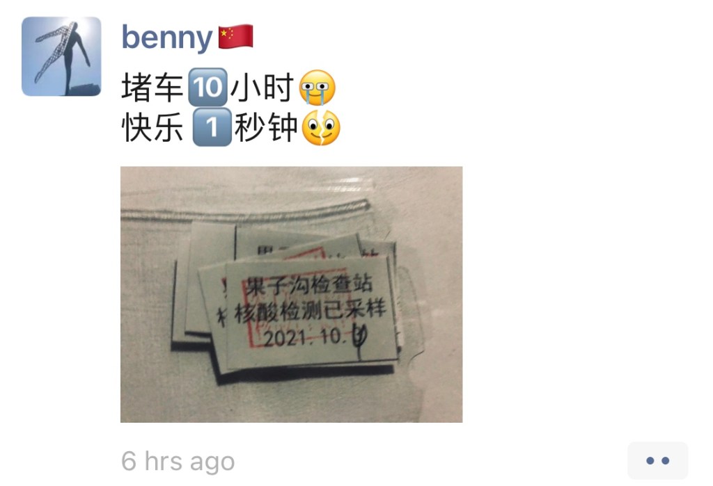 (The slip reads “Guozigou Checkpoint: Covid test sample taken on 4 Oct 2021”)